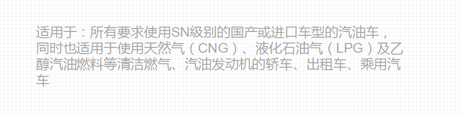 適用于所有要求使用SN級別的國產(chǎn)或進(jìn)口車型的汽油車,同時(shí)也適用于使用CNG、LNG及乙醇汽油燃料的出租車、乘用汽車。