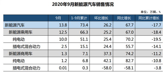 9月新能源汽車增長勢頭強勁,新能源汽車生產(chǎn)13.6萬輛,同比增長48%;9月銷售新能源汽車13.8萬輛,同比增長67.7%。不過受今年以來新能源汽車下滑嚴重影響,前9月新能源汽車累計生產(chǎn)73.8萬輛,下滑18.7%;前9月累計銷售73.4萬輛,下降17.7%。
